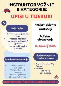 POU Novak poziva sve zainteresirane na upis u program obrazovanja za stjecanje cjelovite kvalifikacije Instruktor/ica vožnje B kategorije.
